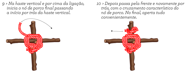 Começa e termina com o nó de porco, assegura-te que o primeiro está abaixo da haste horizontal.